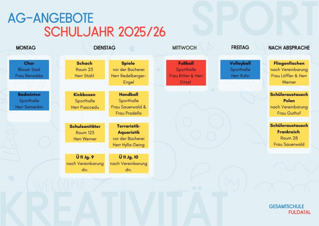 AG-Angebote Bei Fragen steht Frau Sauerwald (Ganztagskoordinatorin) gerne zur Verfügung: petra.sauerwaldatgsfuldatal.de.