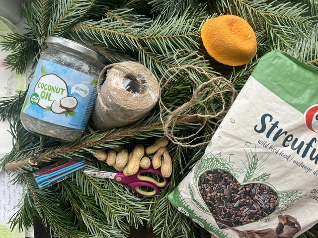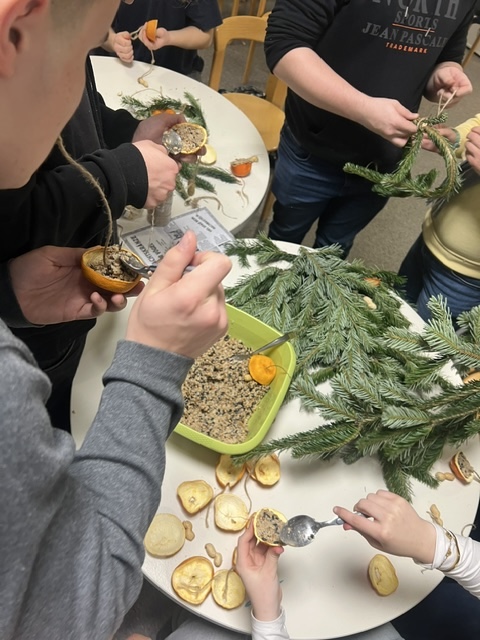 In der letzten Schulwoche wurde die Mittagspause an unserer Schule, am Montag, den 15. Dezember 2025, besonders kreativ und festlich: Bei einer offenen Bastelaktion waren alle Schülerinnen und Schüler herzlich eingeladen, weihnachtliche Vogelkränze herzustellen. Mit viel Freude und Konzentration entstanden aus frischen Tannengrün, getrockneten Orangenschalen, Vogelfutter in Kokosöl und Erdnüssen, liebevoll gestaltete Kränze, die nicht nur schön aussehen, sondern auch unseren heimischen Vögeln in der kalten Jahreszeit helfen.
