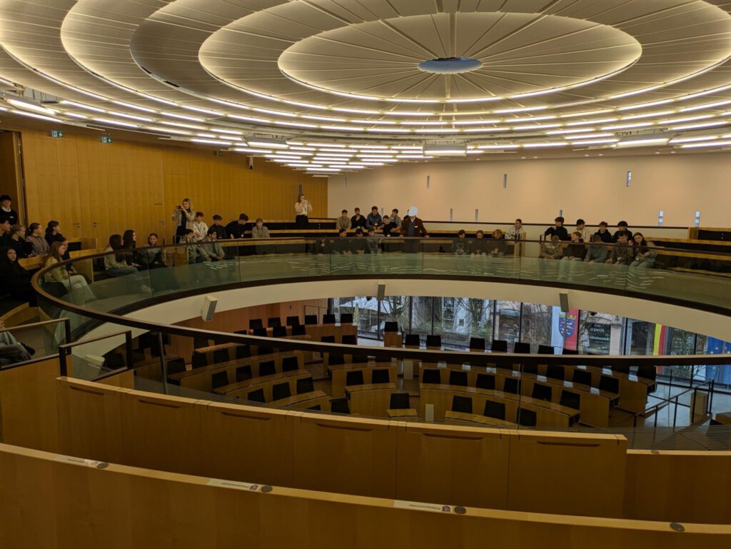 Nachdem die 65 Schülerinnen und Schüler mit ihren Lehrkräften trotz eines heftigen Schneesturms gut in Wiesbaden angekommen waren, erhielten sie im Landtag zunächst eine Einführung durch Herrn Lucas, der über die Geschichte und die Aufgaben des Hessischen Landtages informierte. Nachdem die Sitzungen das Landtages früher in den prunkvollen historischen Räumen des Wiesbadener Stadtschlosses stattgefunden hatten, tagen die Abgeordneten seit 2008 in einem modernen Plenarsaal. Bei einer Führung konnten die Schülerinnen und Schüler sehen, wie in diesem Saal die Sitze kreisförmig angeordnet sind, sodass sich die Abgeordneten während der Debatten anschauen können. Die großen Außenfenster des Saals zeigen, dass die politischen Entscheidungen in unserer Demokratie transparent sein und nicht hinter verschlossenen Türen stattfinden sollen.