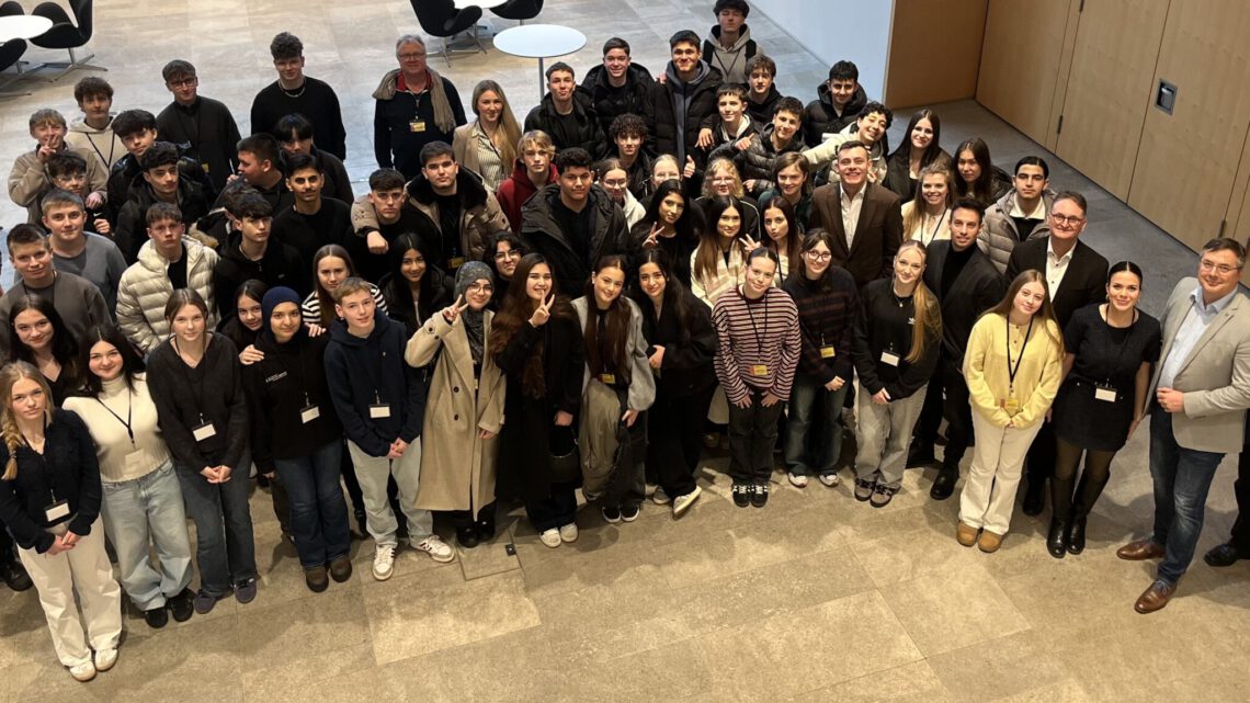 06/03/2026Welche Meinung haben Politiker zu Themen, die Schülerinnen und Schüler beschäftigen? Das wollten die PoWi-Kurse des Jahrgangs 9 sowie weitere interessierte Schülerinnen und Schüler mit ihren Lehrkräften, Frau Dippel, Frau Sauer, Herrn Grimm und Herrn Menzel, herausfinden und machten sich deshalb am 19. Februar auf den Weg nach Wiesbaden, um dort an der Dialogveranstaltung „Politik erleben“ des Hessischen Landtags teilzunehmen. Im PoWi-Unterricht hatten die Schülerinnen und Schüler zuvor Fragen formuliert, bei denen es vor allem um die Positionen der Parteien zur Schulpolitik ging. Das war naheliegend, da die Schulpolitik Ländersache ist und die wichtigsten Entscheidungen dazu im Hessischen Landtag getroffen werden.
