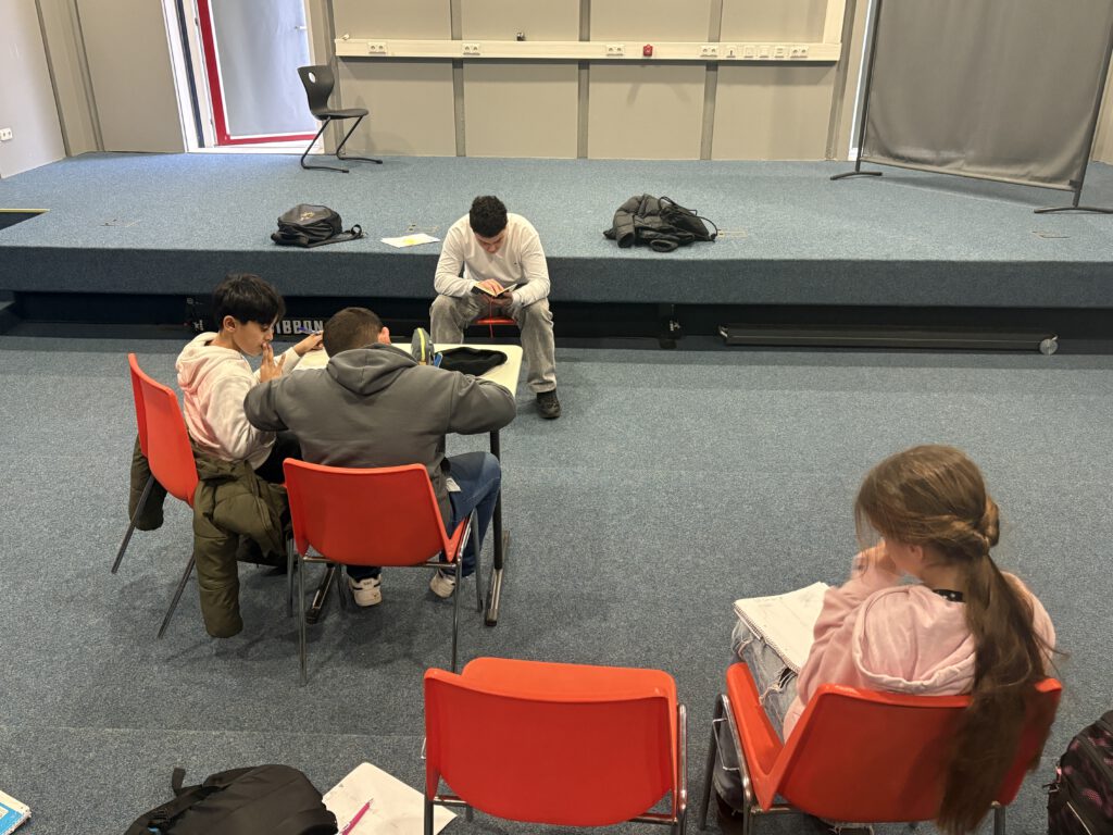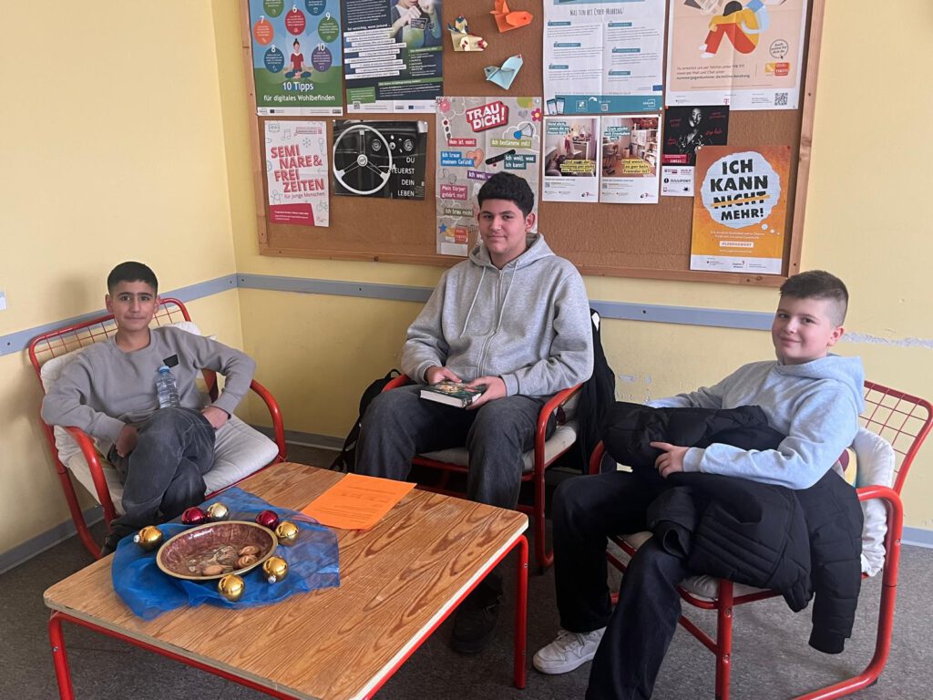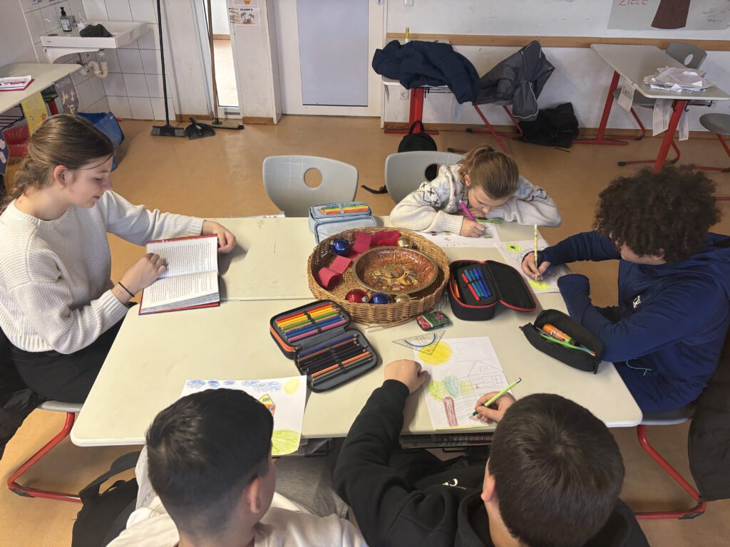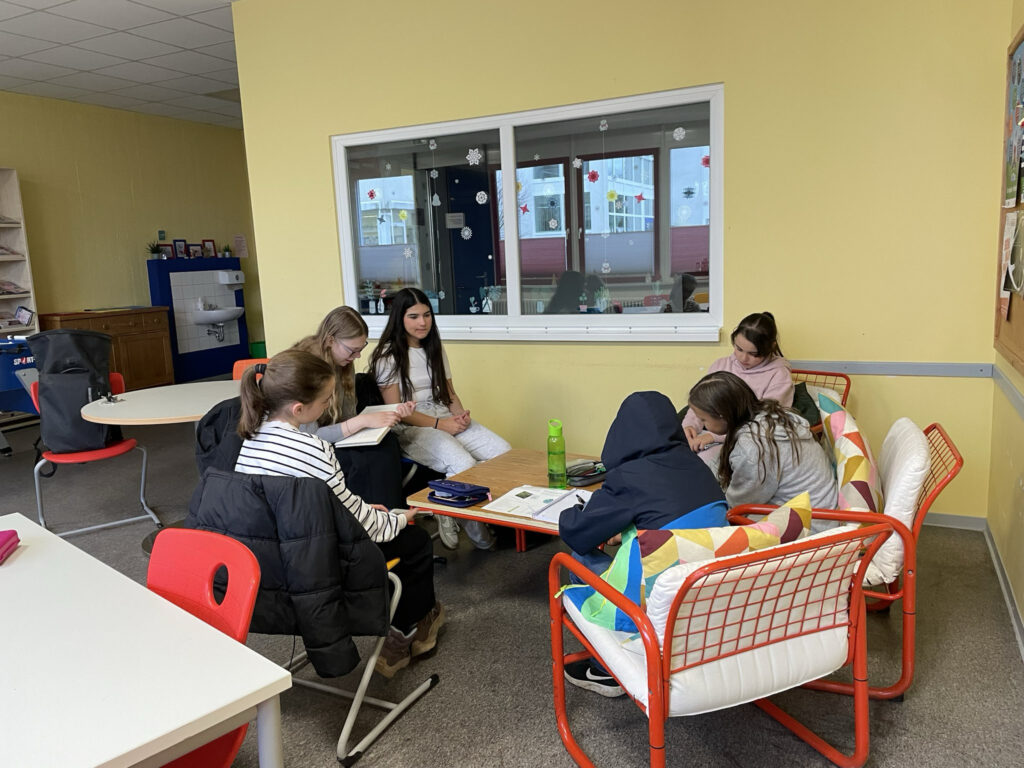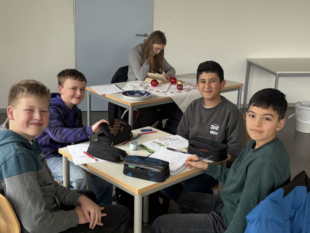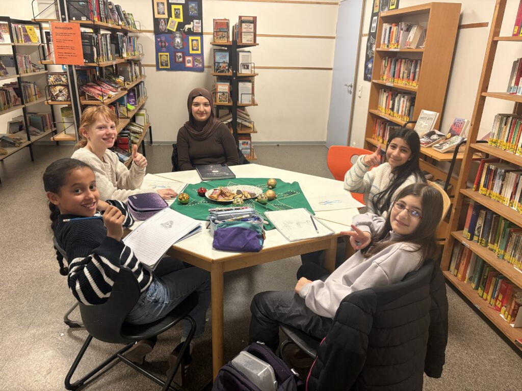 17/12/2025Am Mittwoch, den 17. Dezember 2025, kurz vor den Weihnachtsferien, folgte der Jahrgang 5 einer Einladung der Schulbücherei zum weihnachtlichen Vorlesen. In kleinen Gruppen fanden sich die Schülerinnen und Schüler zum Beispiel im Blauen Saal, der „Bananenbude“ oder in der Bücherei zusammen und ihnen wurde von älteren Schülerinnen und Schülern vorgelesen.